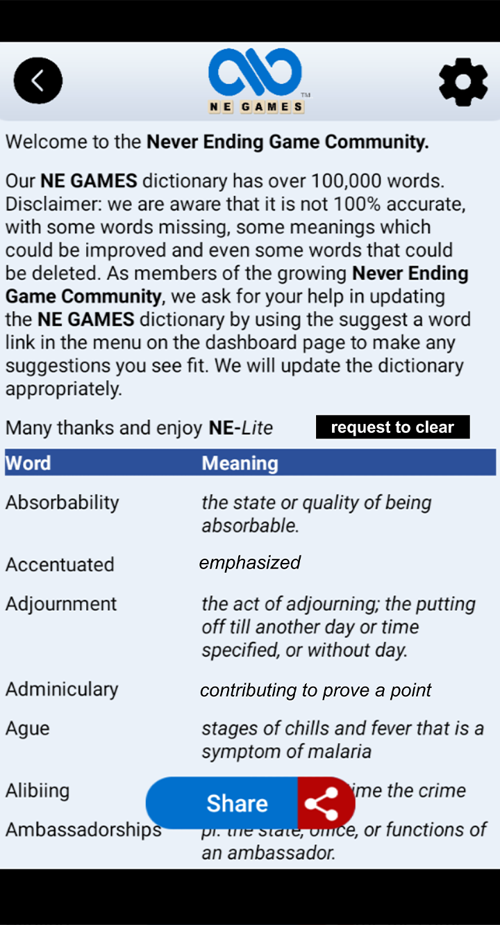 Disclaimer: The NE GAMES Dictionary has over 100,000 words. However, we are aware that it is not 100% accurate and that